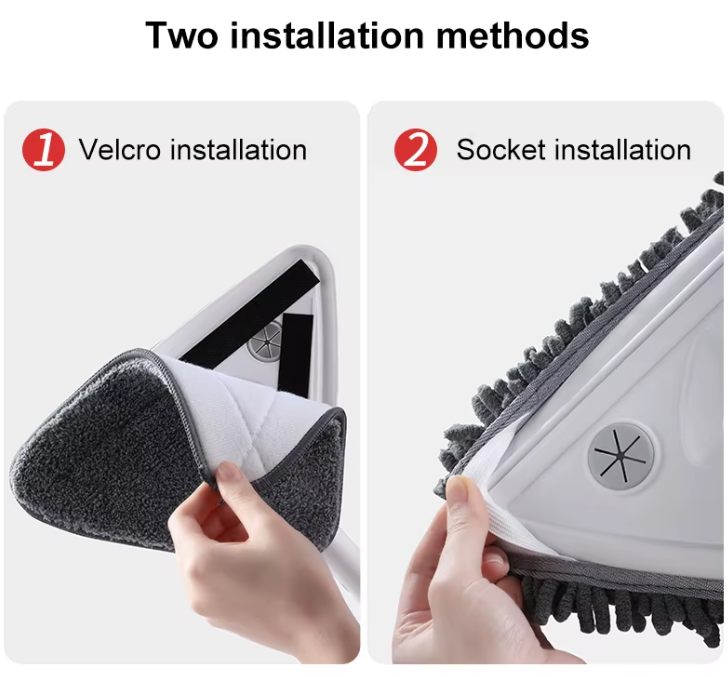 Diseño triangular: Está equipado con un paño de trapeador de microfibra espesado y encriptado, que puede absorber agua rápidamente en 5 segundos y tiene una excelente capacidad de adsorción, bloqueando firmemente el polvo.